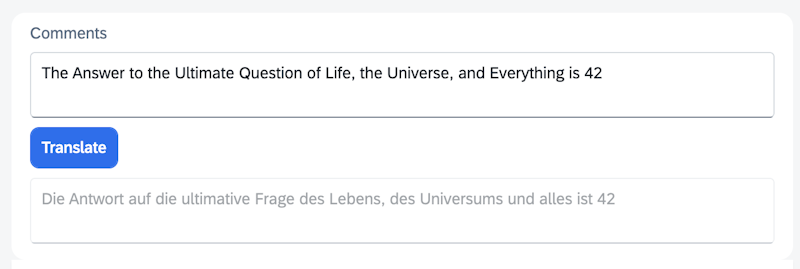 The integration of SAP BTP Translation Hub is done on the previous application. Here we connect to the TranslationHubAPI and use the APIKey from the first example. With this API we can do translations, for example of the comments field.